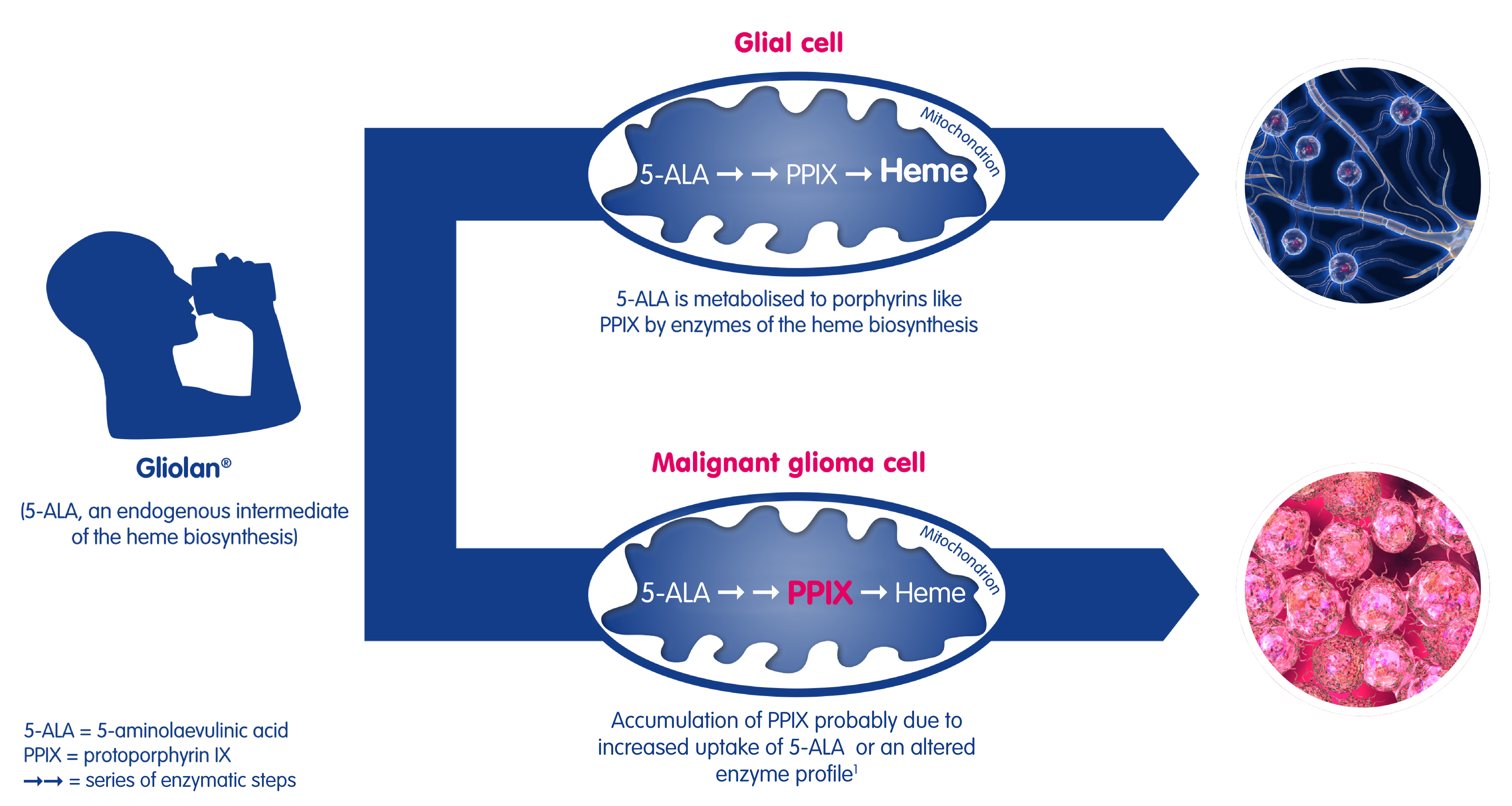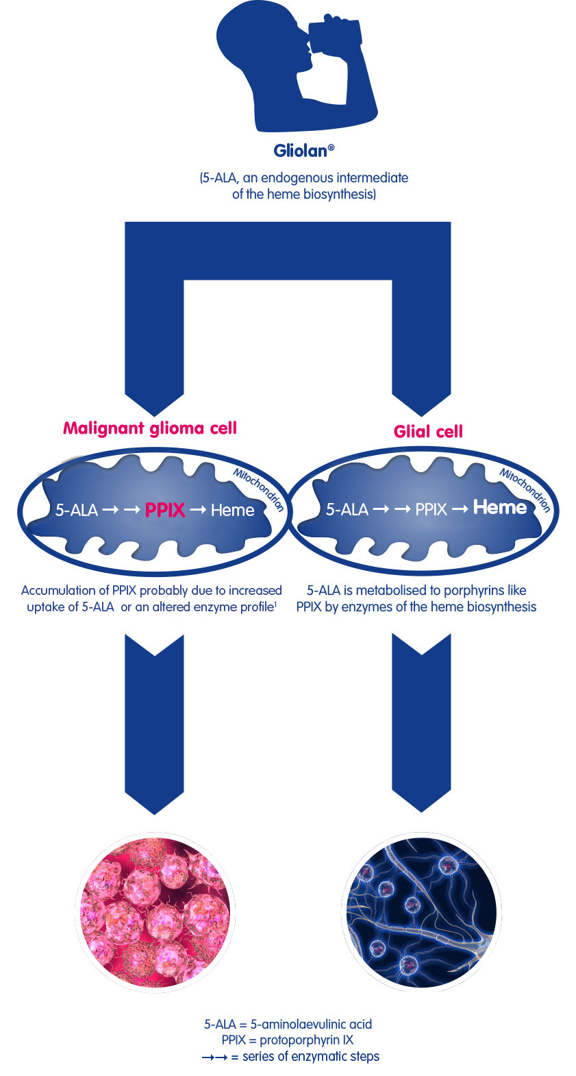 Mode of action: After administration of Gliolan® (5-ALA), malignant glioma cells selectively accumulate a fluorescent dye protoporphyrin IX (PPIX)1,2